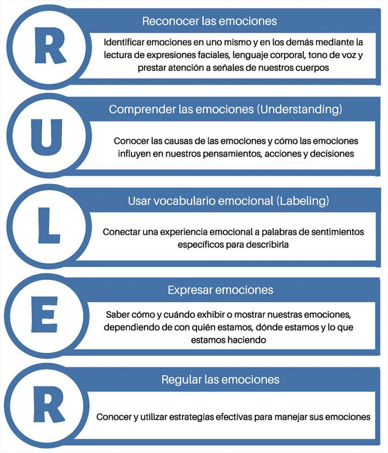 El nombre RULER es un acrónimo de cinco competencias clave. Se aplica tanto a estudiantes como a docentes y familias.