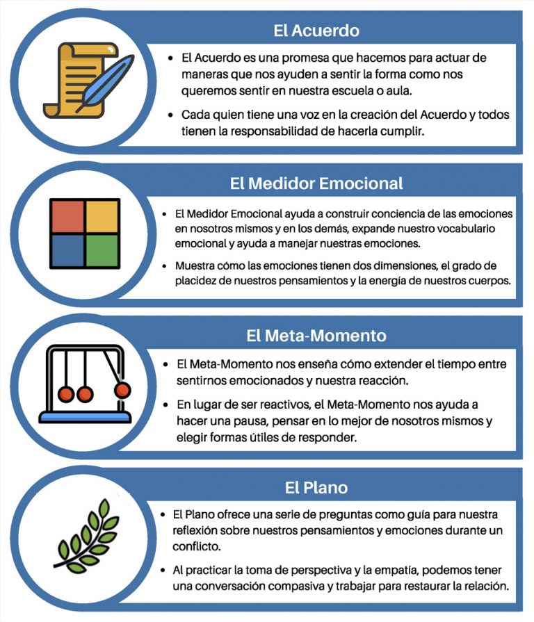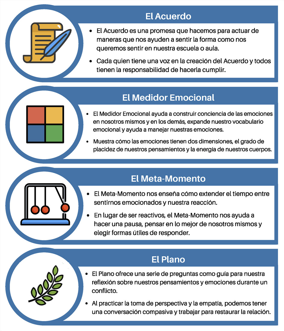Entre ellas destacan el el Acuerdo, el Medidor Emocional, el Meta-Momento y el Plano. Estas herramientas ayudan a identificar emociones, reflexionar antes de actuar, resolver conflictos y crear acuerdos de convivencia.
